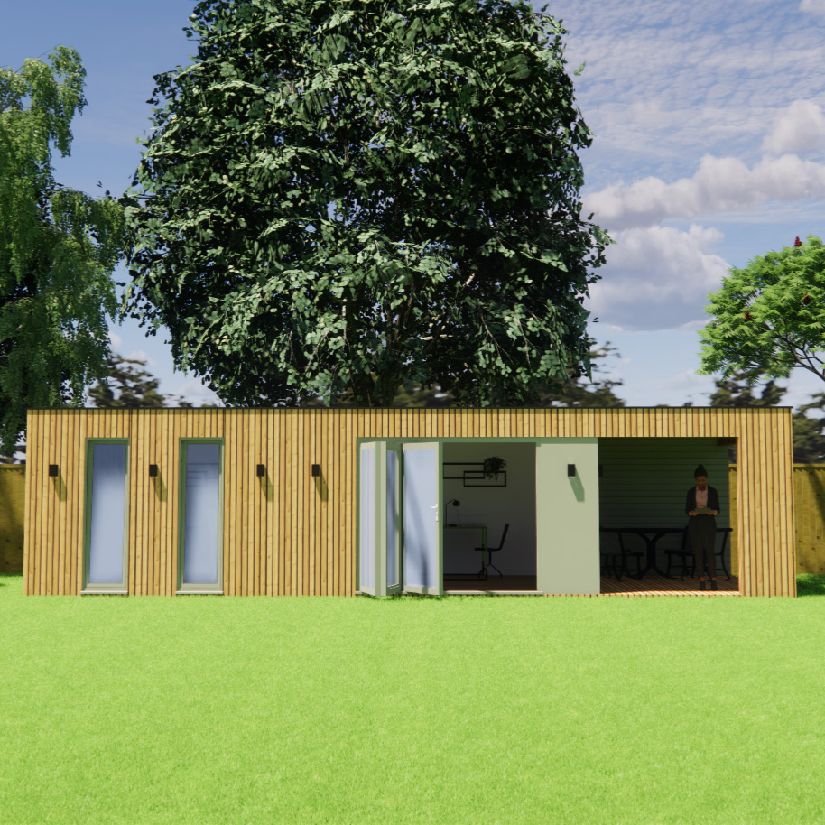 A modern, rectangular wooden house with tall, narrow windows and a large tree in the background. There is an open sliding door leading to a small shaded patio where a person is sitting. The house is surrounded by bright green grass and a clear, blue sky. - a room in the garden