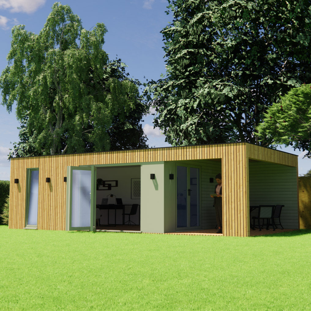 A modern, single-story tiny house with wooden cladding and large glass doors sits in a lush green garden. Tall trees surround the house, providing shade. A person is visible inside, standing near the doorway. Outdoor seating is arranged on the patio. - a room in the garden