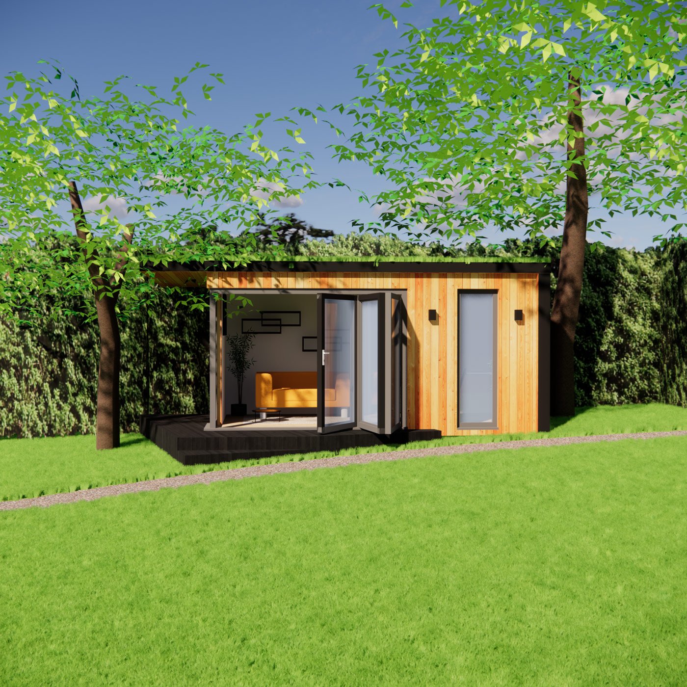 A small wooden house with large glass doors stands amidst a green lawn. The house has a minimalist, modern design and features a cozy interior with visible furnishings. Tall, leafy trees frame the structure, creating a serene and natural setting under a clear blue sky. – a room in the garden