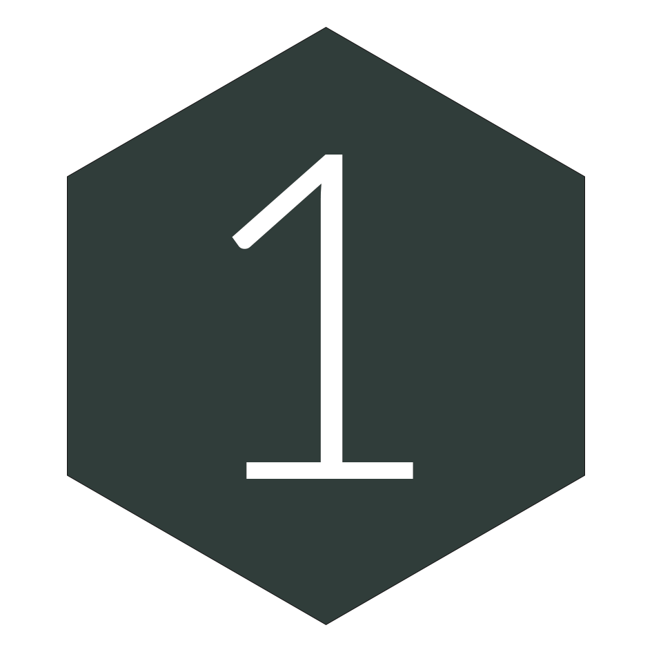 A dark hexagonal sign with a white number “1” centered in the middle. The background is solid dark gray, and the number is bold and prominent. – a room in the garden