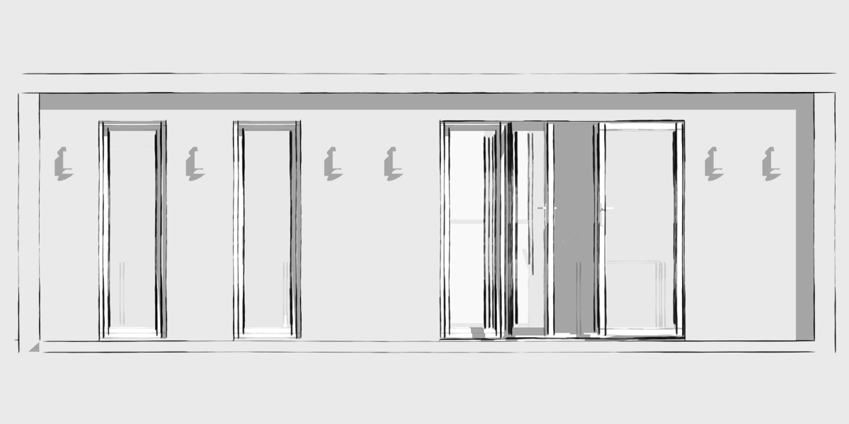 Black and white sketch of a storefront featuring three tall, narrow windows on the left and a glass double-door entrance on the right. The façade is minimalistic and modern, with clean, straight lines and simple details. – a room in the garden