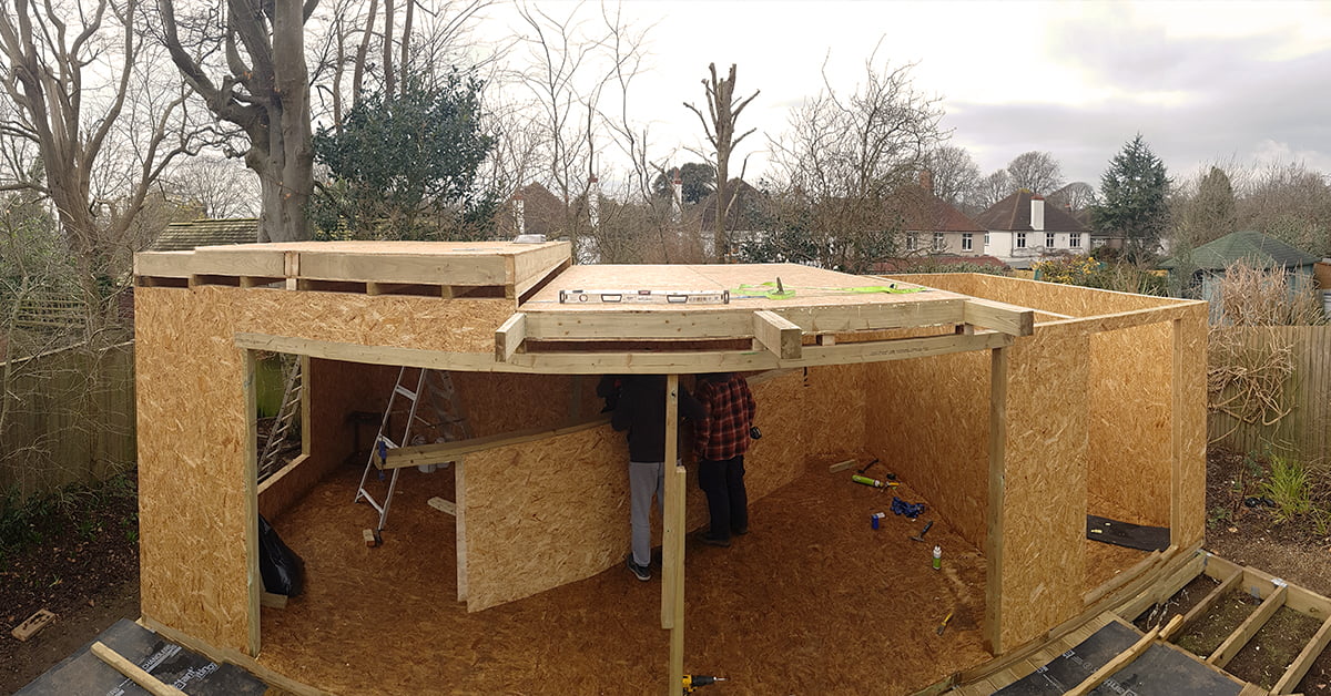 A partially constructed wooden structure stands amidst a background of leafless trees and houses. Two people work inside, surrounded by tools, construction materials, and SIP panels. The roof is incomplete, exposing the interior and a ladder propped against an unfinished wall. – a room in the garden