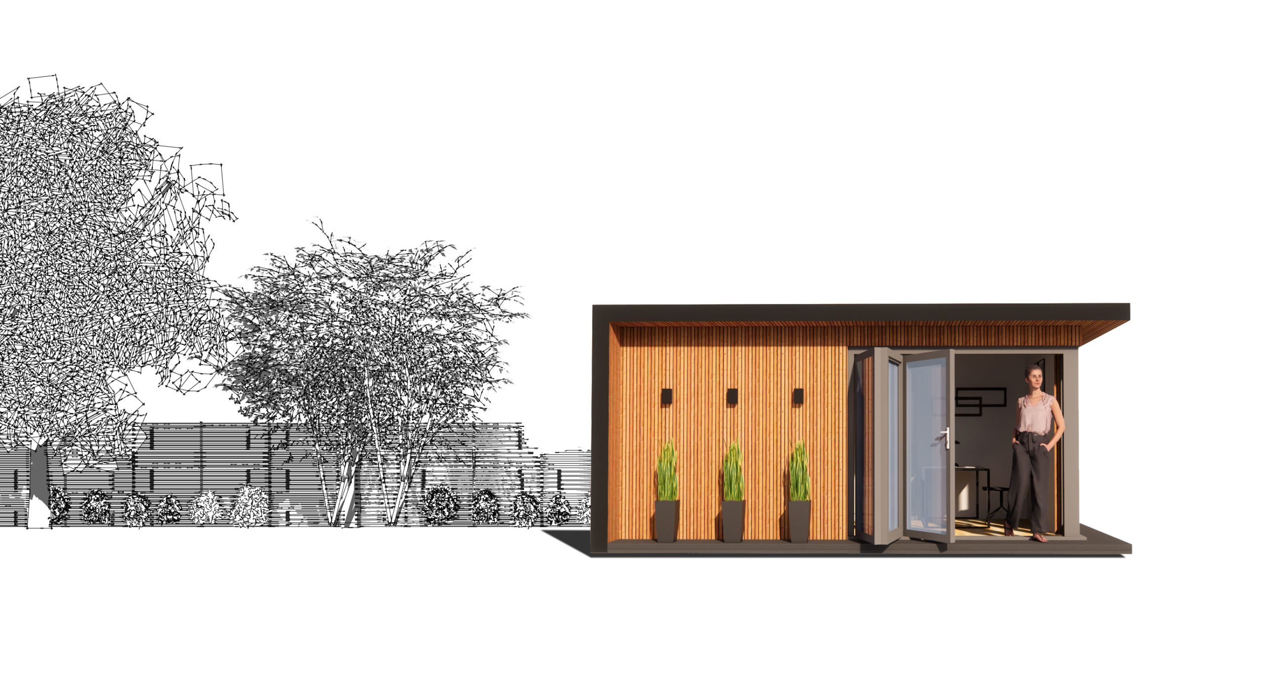 A modern tiny house with a flat roof featuring a wooden facade and three decorative plants in black pots. A person stands in the doorway, looking out. In the background, alongside digitally rendered trees and a fence, there are hints of garden rooms enhancing the serene environment. – a room in the garden