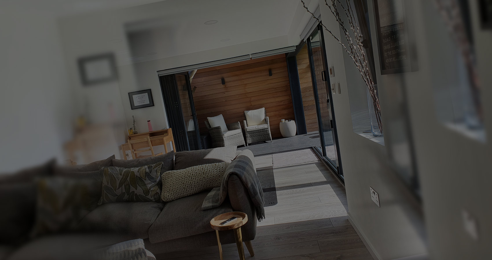 A modern living room with a gray sectional sofa adorned with patterned pillows and a throw blanket. A small round wooden side table is beside the sofa. Large glass doors open to a wooden deck with two cushioned outdoor chairs, seamlessly connecting the interior to stylish garden rooms. The space is well-lit and airy. – a room in the gardenLukas2024-06-18T15:39:42+00:00