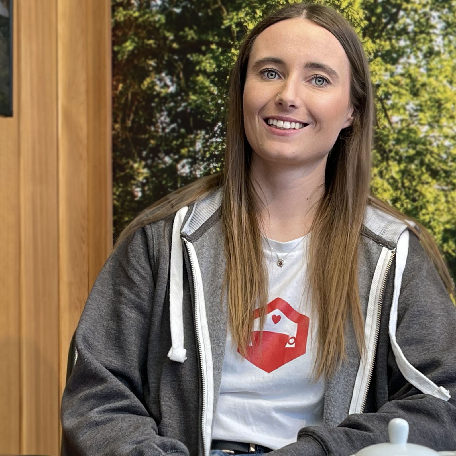 A woman with long brown hair smiles while sitting indoors. She is wearing a white T-shirt with a red logo, a gray zip-up hoodie, and is in front of a wooden wall with a window revealing greenery outside. The lighting is soft, emphasizing her joyful expression. – a room in the garden
