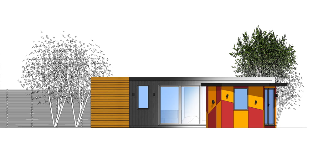 A modern single-story house with a flat roof, featuring a combination of gray, yellow, and red exterior walls. Large glass sliding doors are centered, and the house is flanked by white-leaved trees on either side. – a room in the garden